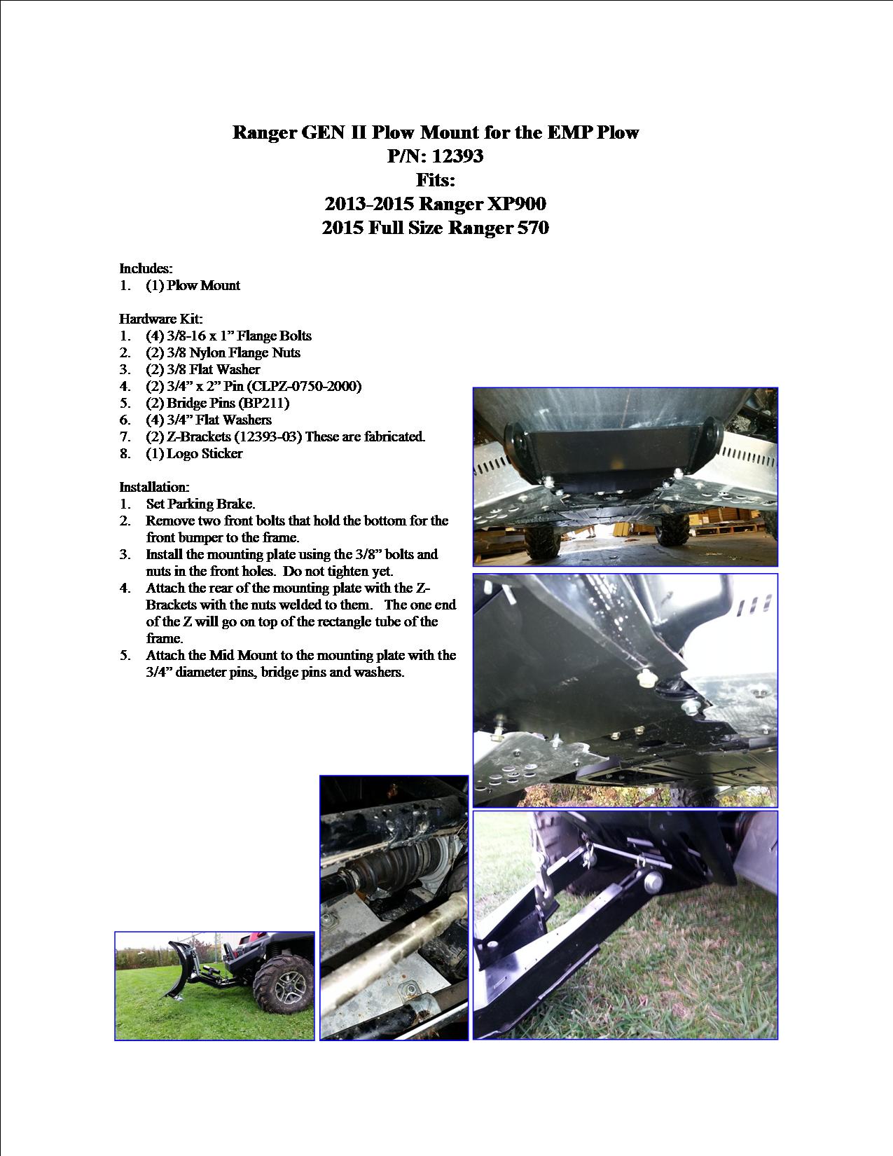 The mold boards are made from 14 gauge steel and have 1/4" thick laser cut braces. They feature manual angle adjustment (left, right, center positions) or an optional electric over hydraulic power angle (sold separately, see Power Angle). Our wear blade is made from AR plate (Abrasion Resistant Steel) and is 4" high. Others on the market are much thinner and shorter, wearing out much sooner. EMP plow frames are laser cut from 1/4" and 3/8" thick steel. The parts fabricated with the tab and slot method. In other words, the parts fit together like a puzzle before welding. This ensures a perfect fit every time. Our plow mounting system mounts to the front and underside of the UTV with the supplied hardware. The mount can easily be removed at the end of the season with six bolts. The plow attaches in less than a minute with the supplied hitch pins.